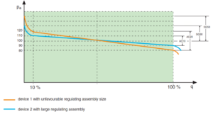 If we look at the 10% stroke (flow) and the 100% stroke (flow) it is obvious that at 10% device 1 requires 120% pressure and device 2 110% pressure. At 100% the same applies but 80 & 90%.