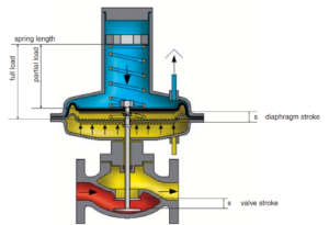 The typically falling characteristic curve of a gas pressure regulator with a spring/diaphragm system is caused by the setpoint spring used. The force of a spring changes when it is being compressed. The more a sprig is being compressed, the greater the return force. Looking at the full and partial load range, the direct correlation to the change in length of the pretensioned setpoint spring can be seen:
